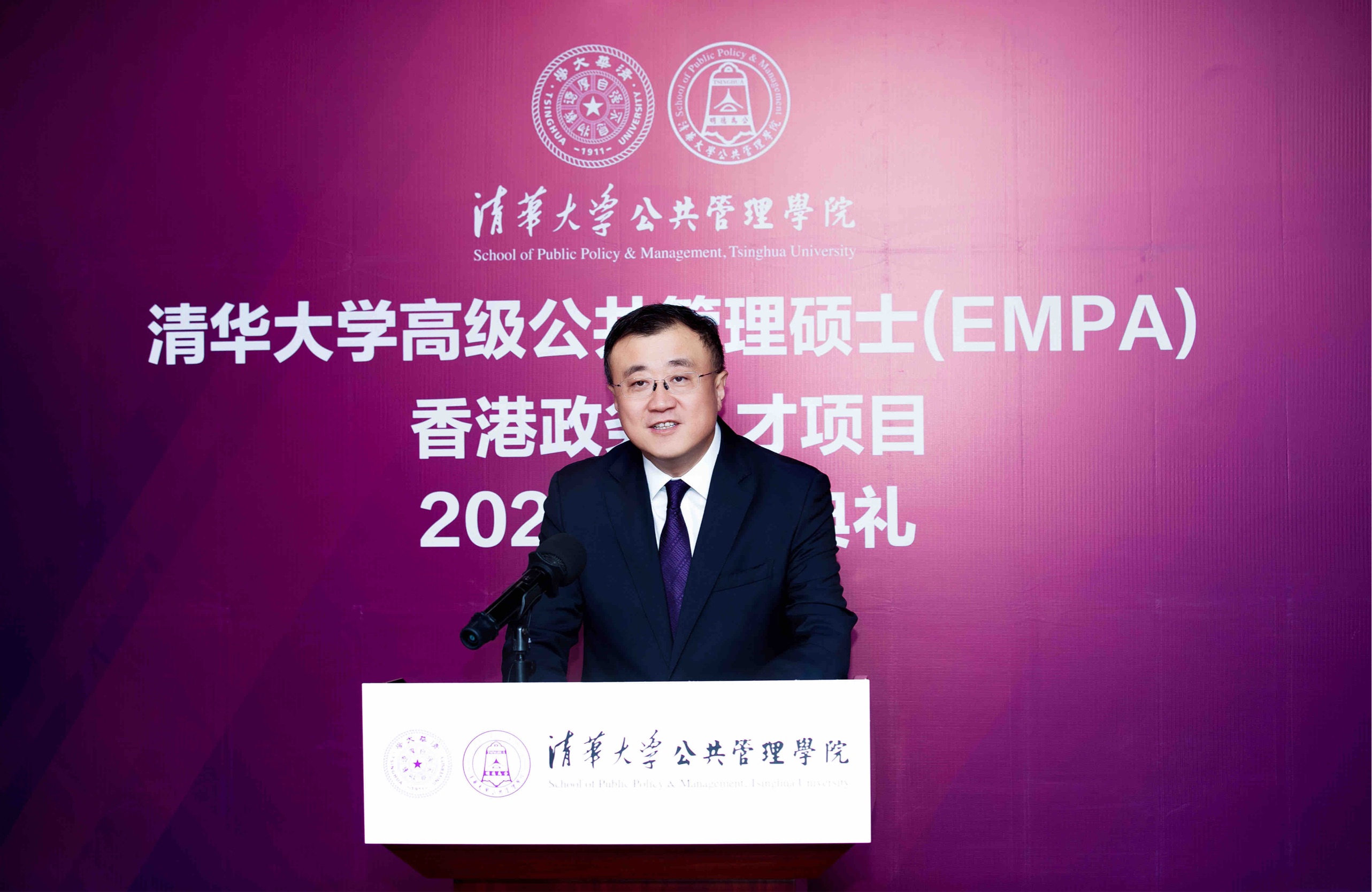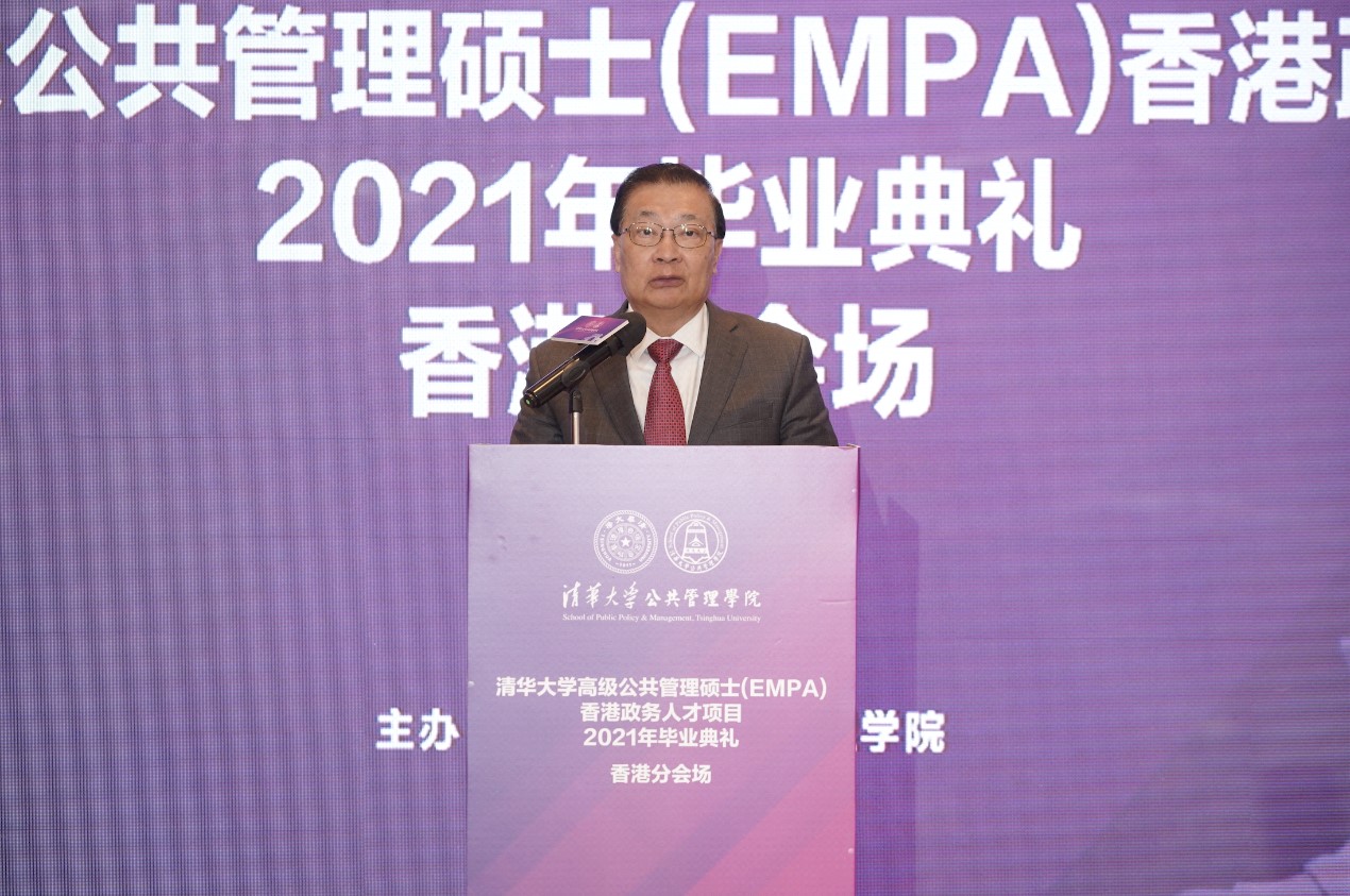 全国人大常委会委员、项目顾问谭耀宗在致辞中表示,该项目由全国最高学府清华大学和国内排名A+的公共管理学院主办,对弥补香港治理人才的缺口非常有益,在各方努力下,该项目已招收四届学生,希望项目越办越好。在过去两年多以来,香港社会经受了多重考验和挑战,在中央政府的帮助和支持下,香港社会逐渐稳定。谭耀宗常委期望同学们在未来的日子里,一定要坚决维护“一国两制”,要积极融入国家发展大局,维护国家安全和国家利益,不断奋斗,不断努力,不忘初心,不忘使命的担当,努力不辜负社会各界对同学们的期望。