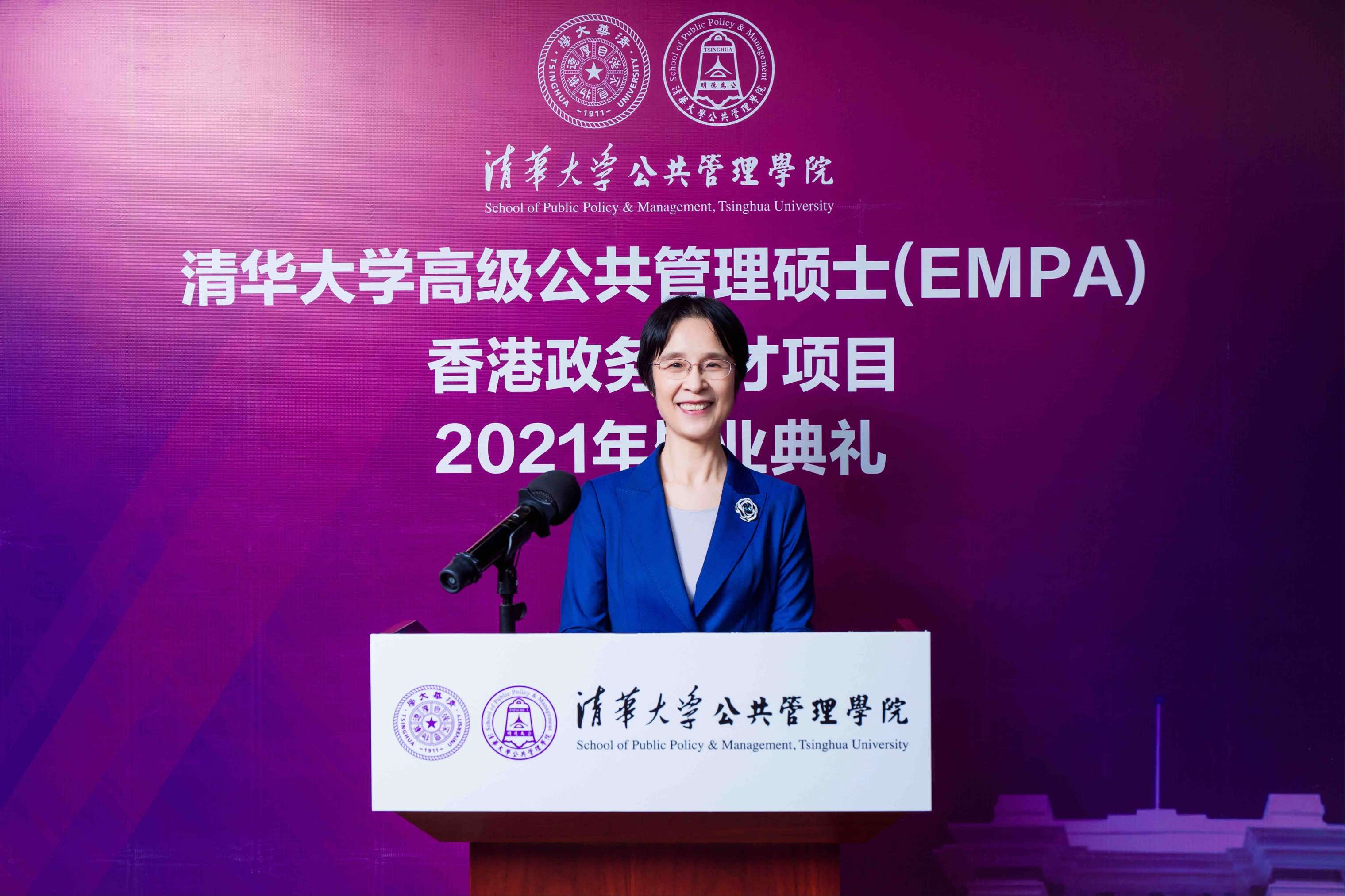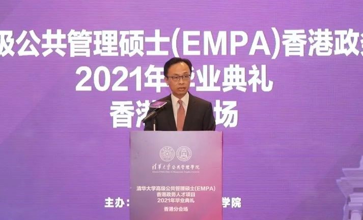6月26日下午,清华大学高级公共管理硕士(EMPA)香港政务人才项目2021年首届毕业典礼以北京主会场和香港分会场现场连线的方式隆重举行。清华大学副校长杨斌教授,清华公管学院院长江小涓教授,香港特别行政区政府公务员事务局局长、太平绅士聂德权先生,全国人大常委会委员、香港再出发大联盟秘书长、项目顾问谭耀宗先生分别在北京及香港两地出席典礼并致辞。清华公管学院党委书记彭宗超教授主持了毕业典礼。