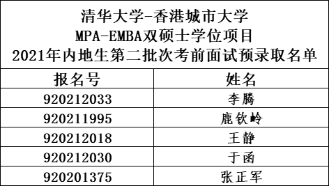 清华大学-香港城市大学MPA-EMBA双硕士学位项目2021年内地生第二批次考前面试结果公示