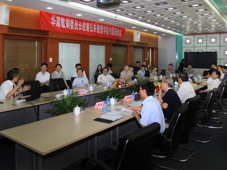 校党委常务副书记、副校长陈旭,党委副书记史宗恺,原党委书记、21世纪发展研究院首任院长方惠坚,公管学院院长薛澜,党委书记王有强等接待了华建敏一行。随后华建敏一行与公管学院师生三十余人进行了座谈。公管学院北京哲社应急管理研究基地主任彭宗超教授,社会保障战略研究课题负责人杨燕绥教授,国家自然基金重点课题——行政管理体制改革课题组负责人王有强教授和于安教授就各自领域研究的进展情况及未来的工作设想进行了汇报。与会教师分别就国企改革、政府采购、国家战略规划等与华建敏一行进行了深入交流与讨论。