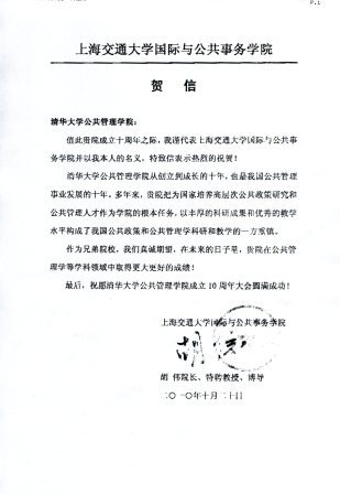 值此贵院成立十周年之际,我谨代表上海交通大学国际与公共事务学院并以我本人的名义,特致信表示热烈的祝贺!