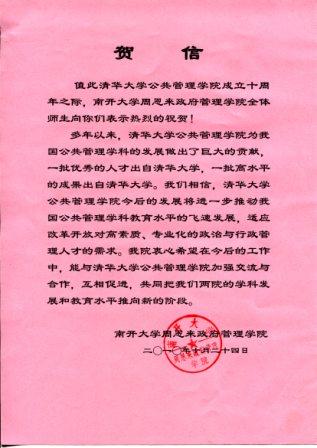 值此清华大学公共管理学院成立十周年之际,南开大学周恩来政府管理学院全体师生向你们表示热烈的祝贺!