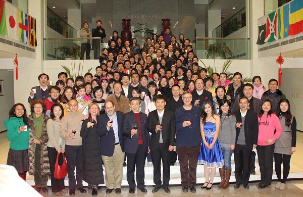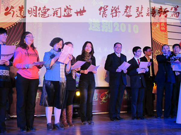 在临近零点时,全场师生到公管一层大厅举杯,在院长薛澜教授的祝福中共庆2011年新年的到来。最终10级博士班的“古今婚礼考”获得了最佳节目的大奖。整场晚会结束后,学院又播放两场精彩的电影,让老师同学们更好的欢度元旦。