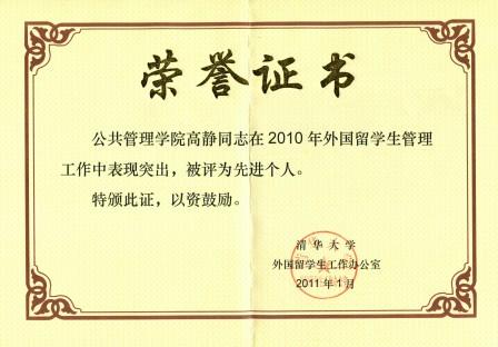 15日,在紫荆公寓19号楼北侧玉树园餐厅举行的清华大学外国留学生管理工作人员新年招待会上,我院高静被评为2010年外国留学生管理工作先进个人。