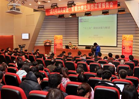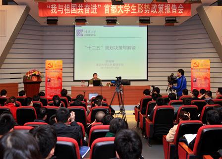 3月16日,“我与祖国共奋进”百场形势政策报告进校园活动启动仪式暨首场报告会在清华大学举行。清华大学公管学院教授、博士生导师,清华大学国情研究中心主任胡鞍钢作了题为《中国特色的决策机制与“十二五”规划》的专题报告。团市委副书记刘震、清华大学党委副书记史宗恺出席报告会。清华大学公管学院党委书记孟庆国主持报告会。市学联主席团单位代表以及首都各高校学生代表200余人参加报告会。