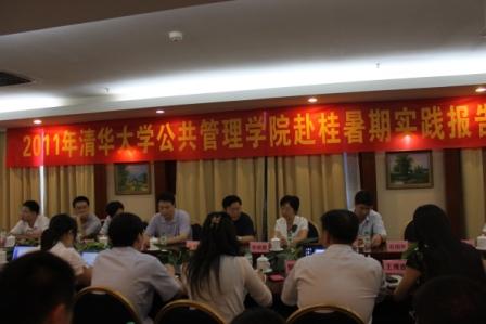 总结报告会由科技厅的钟会超院友主持。在广西壮族自治区公共部门任职的吴宇雄、曾纪芬、张显、李银霞、石国怀、李朝辉等七位院友,南宁市委组织部副部长肖宁,清华大学广西校友会秘书长黄永宁,以及我院研工组汝鹏、刘近文老师参加了总结会。此外,参加博士生暑期必修环节的智强等5位博士生同学也出席座谈会。