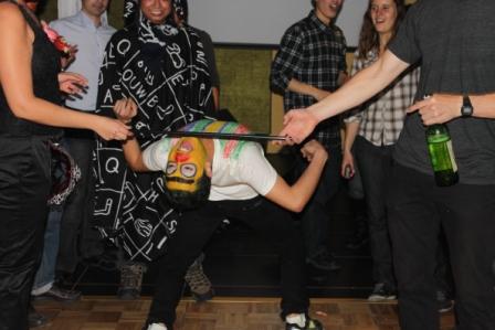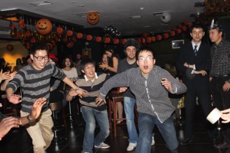 由中国学生设计的“鬼魅人偶”和外国学生提议进行的Limbo游戏是互动环节的主打活动。在“鬼魅人偶”游戏中,中外学生以小组的形式通过互动抢答首先取得设计鬼魅的材料,并经过一番奇思妙想和热烈讨论,以组内某一成员为模特,设计出能够代表自己组的“小鬼”。而在Limbo游戏中,中外学生纷纷挑战身体的柔韧性,比赛下腰。游戏间隔时分,硕11留学生南基雄为了助兴还特别献歌一曲。一时间,欢声笑语、觥筹交错,其乐融融。