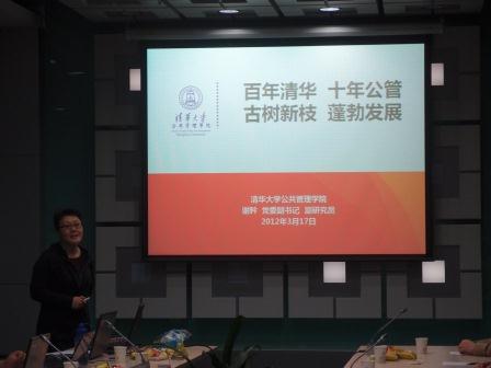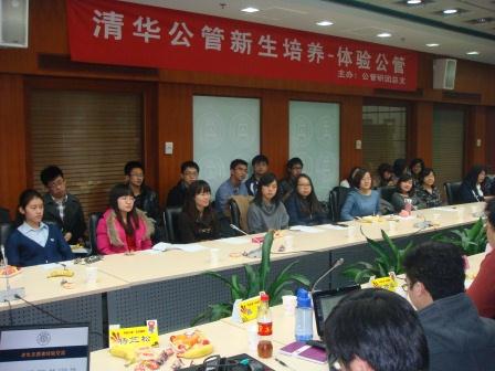 谢矜进行主题介绍,她首先用十六个字概括了公共管理学院在清华大学中的发展特点:“百年清华,十年公管,古树新枝,蓬勃发展。”随后就教学、科研、师资力量、机构设置等基本情况和就业两个方面对学院进行了全面的介绍。最后,谢老师寄语大家:“正心修身以明德,经天纬地而为公。”