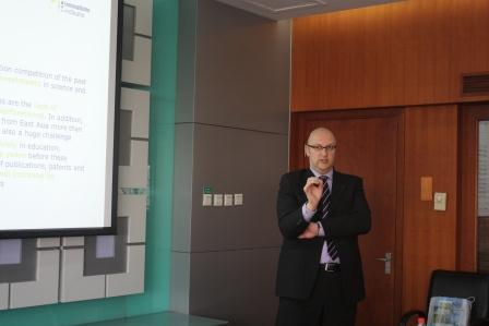 Rainer Frietsch博士详细介绍了由德国电信基金会和德国工业联盟资助,弗劳恩霍夫系统与创新研究院等研究机构独立开展的对全球26个经济体创新能力的创新指标研究。研究基于对国家的科学体系、教育体系、经济体系、社会创新环境体系以及国家政策环境体系的指标设定和分析发现在2011创新指数排名前四位的分别是瑞士、新加坡、瑞典和德国,中国排在第21位。在此基础上,Rainer Frietsch博士深入分析了德国排名上升的动因,并阐述了德国、中国、日本等国创新能力的现状、优势、面临挑战及其未来发展趋势。