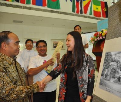 孟波向缅甸大使吴丁乌先生赠送清华卷轴画