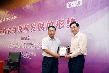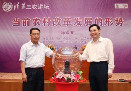 5月29日晚上,“清华三农讲坛”第一讲在清华大学主楼接待厅隆重举行。中央农村工作领导小组副组长、办公室主任,清华大学中国农村研究院(以下简称农研院)院长兼学术委员会主任陈锡文以“当前农村改革发展的形势”为主题发表演讲。清华大学党委书记、校务委员会主任,农研院指导委员会主任胡和平出席讲座,并与陈锡文正式启动了“清华三农讲坛”。国务院发展研究中心副主任、农研院副院长韩俊主持讲座。