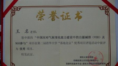 “中国应对气候变化能力建设中的自愿减排(VER)及NGO参与”项目由美国铝业全球基金会资助,是其为推动可持续发展研究提出的“行动解决方案的创新伙伴”计划在中国的项目之一。该研究计划的中方合作机构是中国国际经济交流中心与清华大学公共管理学院CDM研发中心:国经中心着重研究中国发展低碳经济的公共政策和国家战略,CDM研发中心着重研究中国应对气候变化的自愿减排和NGO参与。项目的获奖,将对该项目探索在北京门头沟区军庄镇孟悟村建设“城乡共生型低碳社区的创新模式”,起到积极的推动作用。