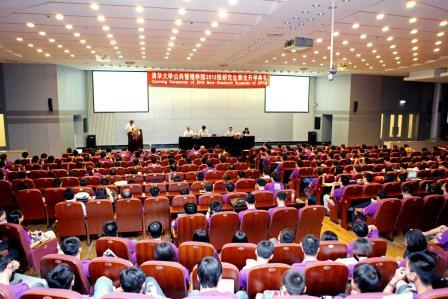 博11班彭龙同学代表学院老生发言,他在发言中提出三点体会和两点建议。一就是“一个大家庭”,公管学院不但要成为大家学习、工作的实体家园,也要成为大家理想、信念的精神家园;二就是“双肩挑,全面发展”,既要以学习科研为根本,扎实掌握理论业务,同时也以工作实践为抓手,积极参加学院、学校的社会工作,使自身得到全方位的锻炼和成长;三就是“三人行必有我师”。同时也建议大家培养自己的“归零心态”,一切从现在开始,过去再辉煌的成绩都要在心态上清除归零,从而放低姿态,一切重新开始;希望大家不要忘记最初的梦想,并始终抱有激情去坚持到底。