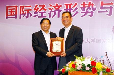 图为韩俊为林毅夫颁发清华三农讲坛纪念证书。 石加东 摄 |