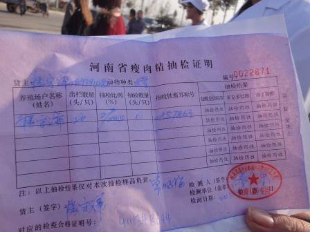 图2 河南省“瘦肉精”抽检证明