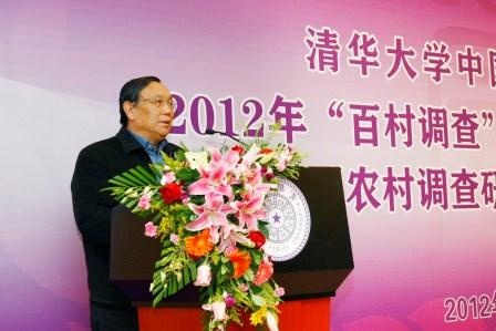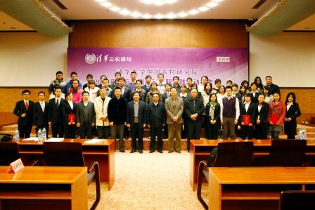 11月29日晚,清华大学中国农村研究院(以下简称农研院)在清华大学主楼报告厅隆重举行“清华三农讲坛”第四讲。本期讲坛主题为“2012年‘百村调查’暑期实践活动报告会暨‘农村调查研究奖’颁奖仪式”。中央农村工作领导小组副组长、办公室主任,农研院院长陈锡文;国务院发展研究中心副主任、农研院副院长韩俊;国家发展和改革委员会城市和小城镇改革发展中心副主任、农研院副院长魏唯;农业部产业政策与法规司司长、农研院学术委员会委员张红宇等领导和嘉宾出席活动。