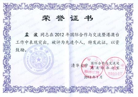 1月11日,在近春园举行的清华大学外事系统迎新春总结联谊会上,我院院长助理、国际合作与交流办公室主任孟波老师在2012年国际合作与交流暨港澳台工作中表现突出,被评为先进个人。副校长袁驷为获奖老师颁发了证书。