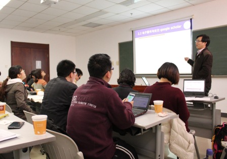 汝鹏老师根据研究生学术的需要,分别介绍了学术期刊和学位论文、书籍、研究报告和working paper、学术会议与媒体报道这五大类信息的获取经验和技巧。在介绍过程中,汝鹏老师结合自身的学术经历,生动有趣地传递了学术技能。从最为基础的学校图书馆信息资源到海量的互联网资源,都能够成为研究生学术资源获取的来源。而各种新兴网络工具、插件与手机app在学术资源获取中的应用尤其令学生们耳目一新,例如汝鹏老师向大家推荐并现场演示的鲜果阅读器和印象笔记等引起了大家极大地关注,同学们纷纷表示回去之后要挖掘、学习。