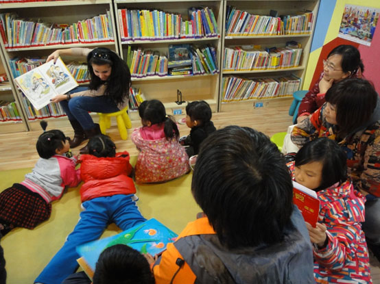 图为留学生给孩子们讲故事
