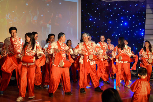 晚会于18:30分开始,在硕12班精心制作的《听涛绝恋》开场视频之后,薛澜、王名、齐晔等老师与同学们一道表演的腰鼓舞蹈《鼓舞公管》作为首个节目登上舞台,红红火火的喜乐氛围瞬间点燃了全场同学的热情,将传统年味与现代风格融于一体的晚会就此拉开大幕。