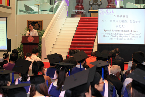 凤凰周刊编委、免费午餐发起人邓飞先生,04级博士班院友、现就职于中央网络安全和信息化领导小组办公室的张新海作为嘉宾代表上台发言,与即将踏上社会道路的毕业生们分享了自己的工作经历和人生感悟。邓飞号召大家为了一个更美好的国家而联合起来,用实际行动去关心我们的空气、水和环境,关切老人、孩子和动物,聚沙成塔,促成改变,进而去解决社会现实问题。张新海结合自己在政府部门工作的经历,对“厚德载物”进行了一番独到诠释,鼓励大家志存高远,从小处着手,从细节做起,多换位思考,在平凡的岗位做出不平凡的业绩。