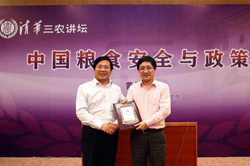 演讲结束后,韩俊为黄季焜颁发了“清华三农讲坛”纪念证书并作总结发言。他指出,黄季焜的报告呈现了他本人及其研究团队最近十几年来关于中国粮食安全问题的研究成果,科研含量很高。黄季焜在报告中引用的数据和模型多是第一手数据和原创模型,每一个判断的背后都有大量研究做支撑,其严谨、认真的治学态度值得大家学习。