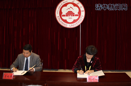 图为清华大学党委书记陈旭与新疆大学党委书记李中耀签署协议。