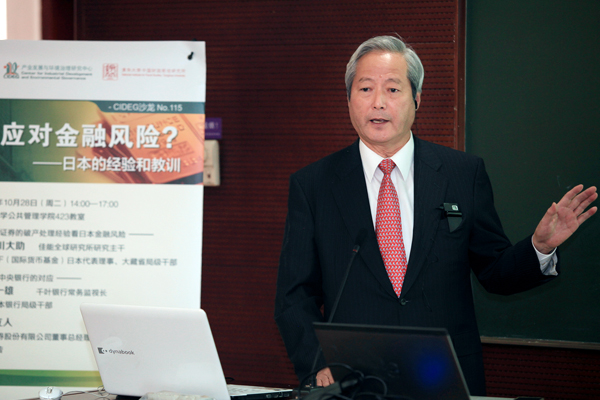 10月29日下午,清华大学CIDEG举行第115期学术沙龙。本次沙龙邀请了曾任国际货币基金组织(IMF)日本代表理事的小手川大助先生和日本千叶银行常任监视长福田一雄先生讲述“如何应对金融风险?——日本的经验和教训”,两位嘉宾分别就《从山一证券的破产处理经验看日本金融风险》和《金融危机时中央银行的对应》两个主题进行了演讲。讲座由CIDEG理事、中信证券股份有限公司董事总经理德地立人先生主持。清华经管学院副院长、清华大学中国财政税收研究所所长、CIDEG学术委员白重恩和CIDEG副主任陈玲,公管学院高宇宁老师等参加了讲座。