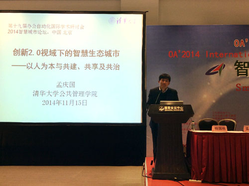 15日下午,政府2.0研讨会与第十九届办公自动化国际学术研讨会“智慧生态城市论坛”并会在北京国家会议中心召开。会议围绕创新2.0时代的智慧生态城市建设进行了热烈的讨论,我院孟庆国教授作为大会副主席出席会议并作主题报告《创新2.0视域下的智慧生态城市——以人为本与共建、共享与共治》。孟庆国教授强调,创新2.0重塑了城市创新发展体制机制与领导力,现代城市的复杂巨系统和自组织系统特性决定了智慧生态城市建设必须重视人的因素并遵循创新2.0发展模式和思路,抓住新一代信息技术的机遇,营造有利于创新涌现的制度和生态,进而推动城市的可持续发展。