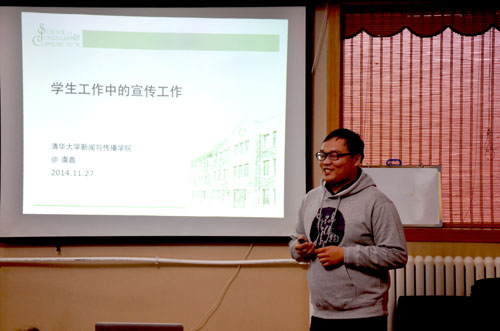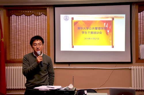 2014年11月27日下午,清华大学公共管理学院学生干部培训会在北京市御苑会议中心举行,公管学院研工组组长蓝煜昕、副组长刘近文出席培训,全院学生干部、部分2015级新生骨干计划成员参加了此次培训。校党委研工部栾和新老师、校研究生团委宣传部部长虞鑫博士担任培训嘉宾,与在场同学进行了充分的交流。