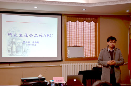 培训会伊始,校党委研工部栾和新老师为到场同学作了“研究生社会工作ABC”主题讲座。栾老师的讲座主要从组织建设、队伍建设和载体建设三个角度展开。