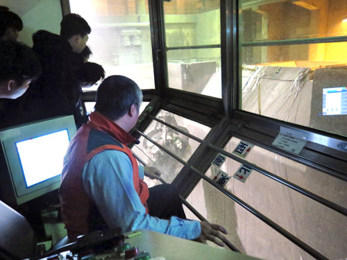 图为八里垃圾焚化厂内部进行垃圾混拌作业。