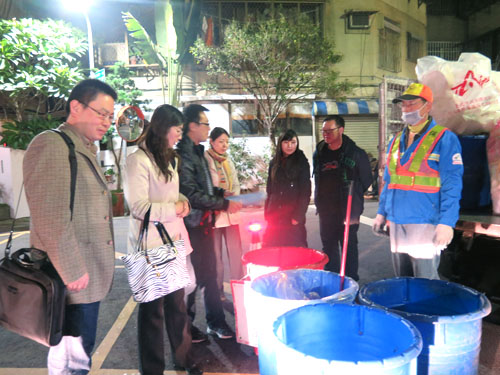 在此基础上,调研组实地观摩了台北市信义区中兴里垃圾收集点。在台北市街头与社区里都没有设置垃圾桶,而是由台北市环保局各区清运队垃圾车定时定点收集。傍晚六时整,在《少女的祈祷》的音乐声中,垃圾车和资源回收车准时停靠在收集点,周围的住户纷纷提着大袋小袋出来投递。除用专用垃圾袋装的不可回收垃圾外,其余可回收物被分门别类投掷到悬挂在资源回收车上的塑料袋中。每台可回收垃圾车专门携带四个大型垃圾桶,分装废纸、塑料、瓶罐、泡沫。针对厨余垃圾也分类征收,剩菜剩饭回收后用于喂猪,其余厨余回收后用于堆肥,现场有4-5名清洁队员在指导居民准确进行垃圾分类。