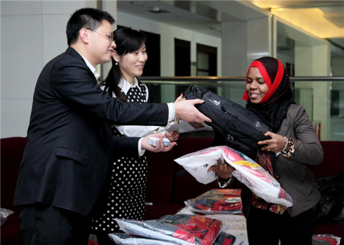 图为中冶海外向IMPA新生赠送冬衣和书包