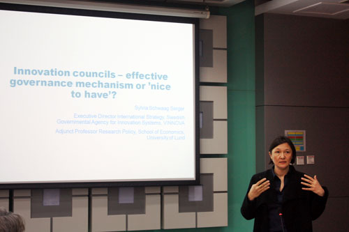 3月17日下午,清华大学中国科技政策研究中心第77期学术沙龙在学院举办,瑞典创新署(Vinnova)国际战略主管、隆德大学兼职教授Sylvia SchwaagSerger博士应邀做了题为“National Innovation Councils – Effective governance mechanism or ‘nice to have’?”的讲座。中心副主任梁正副教授主持本次沙龙,中国科学院科技政策与管理科学研究所顾淑林研究员、中国科技促进发展研究中心原主任孔德涌以及来自清华大学公共管理学院、社会科学学院、中国青年政治学院等单位的老师和学生共计20余人参加了本次沙龙。