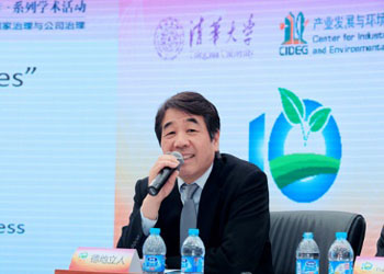 清华大学公共管理学院院长、清华大学产业发展与环境治理研究中心主任薛澜致欢迎词。薛澜介绍了成立CIDEG的目的,以及十年来CIDEG在众多著名学者的支持下已搭建了一个活跃的研究平台,取得了非常丰富的研究成果。薛澜代表CIDEG欢迎福山和青木昌彦教授的到来。
