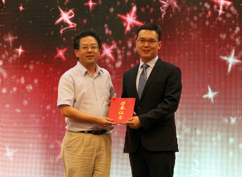 图为导师苏竣教授为郭跃同学颁奖。