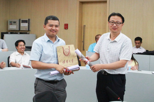图为李怀冰向鄢一龙老师赠送读书会纪念品。