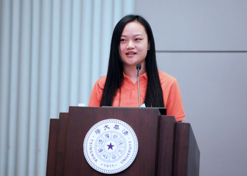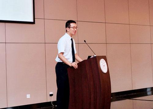 2014级博士生胡叶飞代表学院老生发言,他与新生们分享了自己对“清华”的感受,以“清华”校名解读并寄语新公管人追求学术的心如“清”泉一般纯粹,也散发出耀眼光“华”。