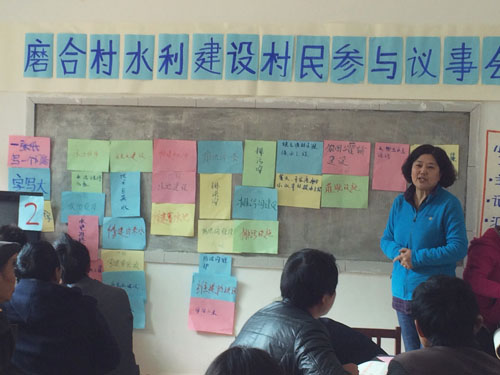 随后,议事会进入关键的后半程,由北京社区参与行动服务中心的宋庆华老师主持。作为国家环保总局宣教中心绿色社区专家顾问、民政部社区建设司社区建设专家组成员,宋老师是国内社区建设方面较有影响的知名人士。她首先请村民就周局长的讲解进行提问、答疑,然后组织35个村民小组的代表按照地域接近原则分为六组,围绕目前各自村民小组面临的水利问题进行第一轮讨论。各小组讨论热烈,水池维修加盖、自来水建设、修建水池、排洪沟、农田灌溉等问题陆续浮出水面。接着,宋老师请各小组进行第二轮讨论,归纳、总结出本小组面临的主要水利问题,并进行汇报、分类。经过村民的集体讨论,共找出七类主要问题。然后,宋老师请周局长对村民提出的这七类问题进行解释,周局长肯定了村民们的讨论,并指出了两个被村民忽视的问题——水土保持和河道治理问题,村民们一致同意把这两项加入进来。