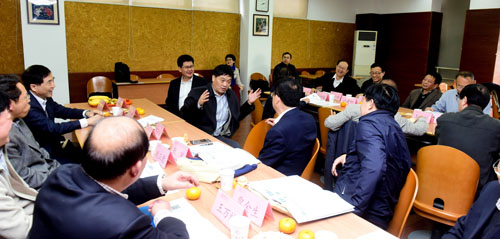 图为院长薛澜(左一)介绍学院发展情况。