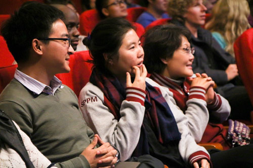 公管先生评选晚会中,学院谢矜(右一)、蓝煜昕(左一)和刘近文(左二)三位老师在认真观看表演