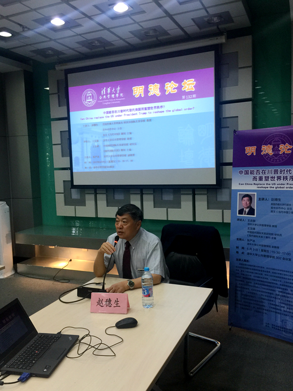 6月9日下午,明德讲坛第132期在清华公管学院302会议室举行。美国丹佛大学约瑟夫·科贝尔国际关系学院教授赵穗生以《中国能否在川普时代取代美国而重塑世界秩序》为题进行主题演讲。论坛由国际战略与全球治理研究所副所长张严冰主持,清华公管学院教授王庆新和中国现代国际关系研究院王文峰担任点评。清华公管学院教授俞樵及数十位师生参加本次论坛。
