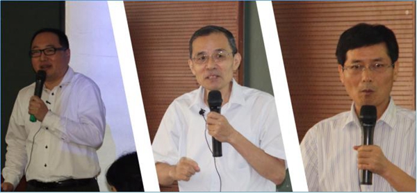 图为程文浩(左)、于安(中)、彭宗超(右)进行案例教学示范与分享。