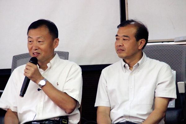 图为张定安(左)与巫永平(右)进行案例研究经验分享。