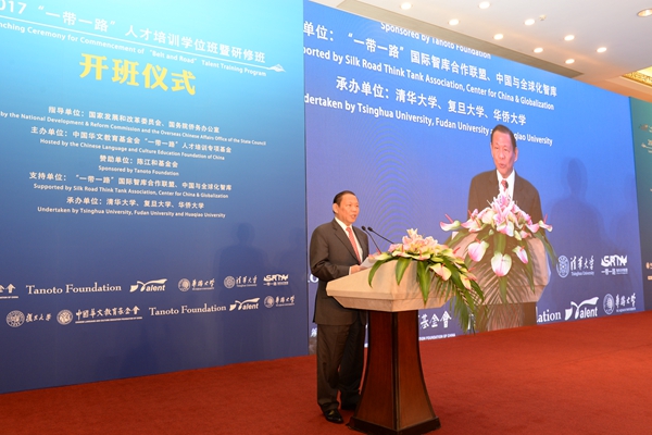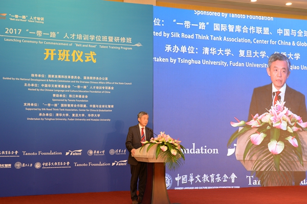 9月19日上午,“2017‘一带一路’人才培训学位班暨研修班”开班仪式在钓鱼台国宾馆隆重举行。中国国家发展和改革委员会副主任张勇,中国国务院侨务办公室副主任谭天星,新加坡金鹰集团主席陈江和,清华大学公共管理学院院长薛澜,清华大学法学院院长申卫星、清华大学公共管理学院副院长朱旭峰,清华大学教育基金会资源开发部部长傅璇等与来自23个国家和地区的122名学员出席开班仪式。中国华文教育基金会副理事长兼秘书长邱立国主持开班仪式。清华大学副校长、教务长杨斌通过视频发表致辞。