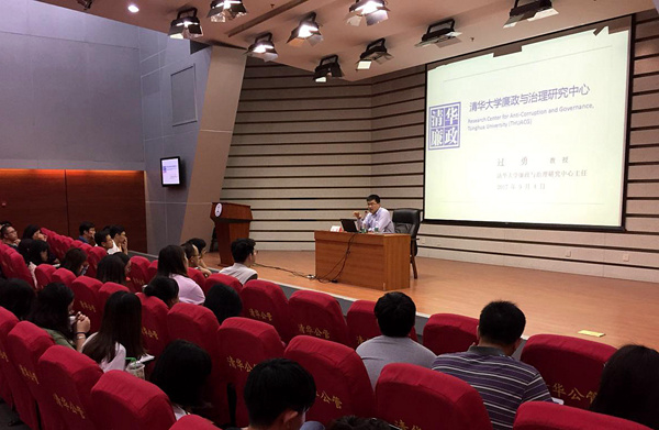 清华大学党委副书记、公管学院党委书记过勇教授为大家讲授了第一堂党课。过老师希望大家能够尽快适应身份转变、学习方式转变、社会工作方式转变,并处理好自由发展与坚守底线的关系、学术科研与社会工作的关系、国际视野与本土情怀的关系。通过过老师的教诲,同学们对自己的研究生生涯有了更为清晰的认识。现场气氛热烈,掌声层出不穷。