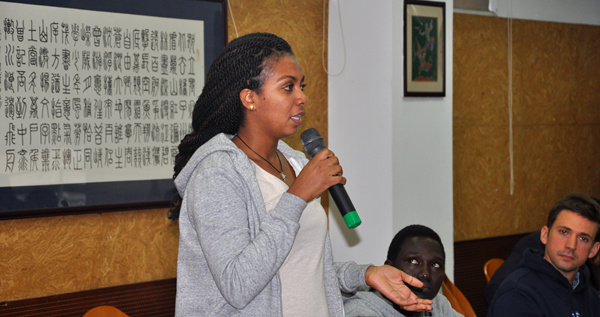 图为坦桑尼亚留学生向Paul Collins博士提问并交流。