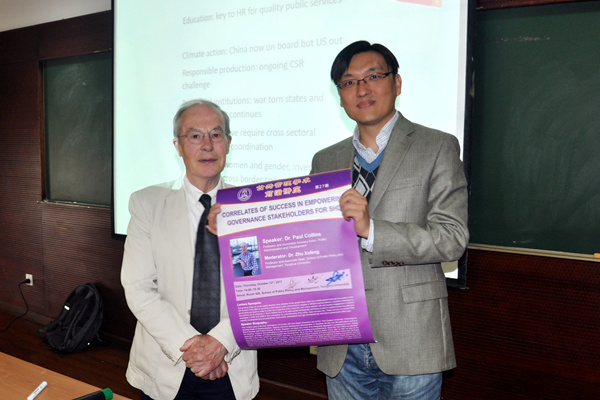 10月12日下午,公共管理学术前沿讲座第27期在清华公管学院428室举办。《公共行政与发展(Public Administration and Development)》期刊荣誉顾问编辑Paul Collins博士以Correlates of success in empowering governance stakeholders for Sustainable Human Development(SHD): Human Resources and Social Capital for Quality Public Service为题发表主题演讲。讲座由清华公管学院副院长朱旭峰主持。清华公管学院副教授梅赐琪与院内外30余位学生出席讲座。