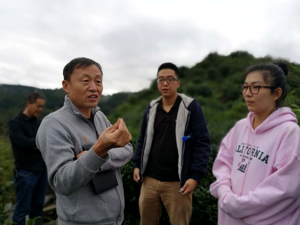 图为调研组向排吾村村长、扶贫工作队和创客了解茶园情况。